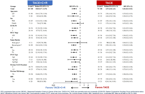 该研究结果显示1,与单纯TACE治疗相比,接受TACE联合卡瑞利珠单抗和阿帕替尼的不可切除HCC患者无进展生存期(PFS)取得了具有临床意义和统计学显著性的改善,显著降低疾病进展或死亡风险。